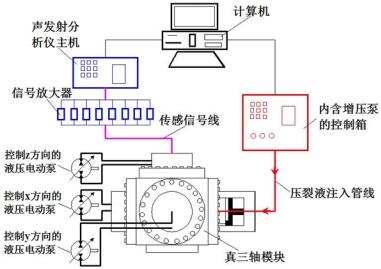 页岩气压裂改造模拟器具具有三个模块:大尺寸真三轴模块、水力伺服泵压模块和声发射模块。大尺寸真三轴模块包括试样放置室、用于对试样进行加压的方形压块,以及与方形压块连接以驱动其对试样进行加压的油压活塞泵,方形压块设有三个,分别在水平、垂直和竖直三个方向挤压试样,每一个方形压块对应设置一个油压活塞泵,三个方向上的油路相互独立互不影响,用这样的方式来对试样施加三向围压以模拟地应力。声发射模块包括安装于大尺寸真三轴试样放置室内的声发射探头,以及与探头电连接的全信息声发射分析仪主机和控制计算机,在水力压裂过程中,声发射探头接收试样破裂发出的声波信号传至声发射分析仪主机上,信号经分析之后传入计算机,水力压裂裂缝定位图即可显示出来,实现对水力压裂过程实现监控。水力伺服泵压模块包括箱体以及用于向试样中预置井筒内注入清水压裂液的高压注入泵。