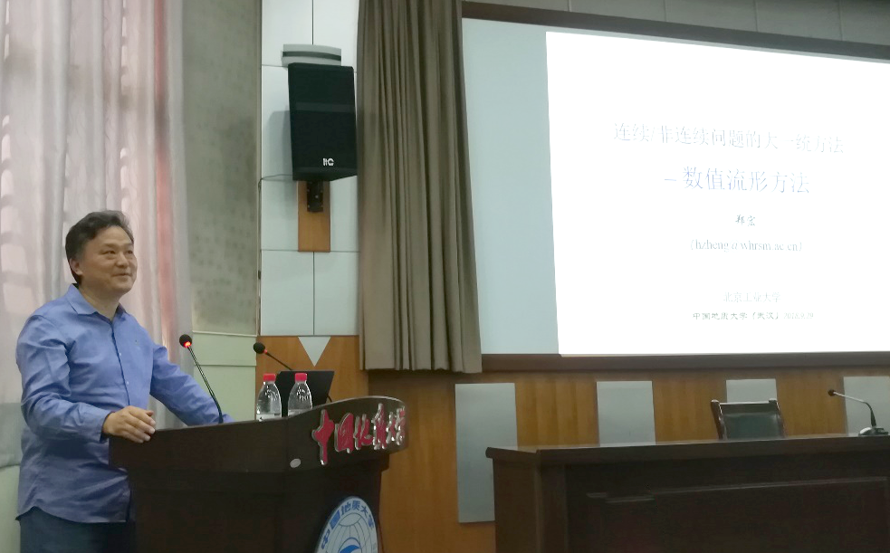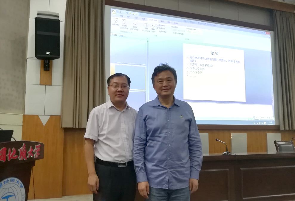 郑宏教授以《连续/不连续问题的大统一方法---数值流形法》为题,详细讲解了数值流形法的基本原理和典型应用。并且通过计算力学史上的几个典型难题,展现了NMM的巨大优势。在讲解的过程中,郑宏教授以FEM着手,深入浅出地讲解了如何实现从FEM到NMM方法的跨越。报告结束之后,郑宏教授不仅详细回答了师生提出的问题,还赠送了NMM的相关理论资料和有详细帮助文档的NMM程序。