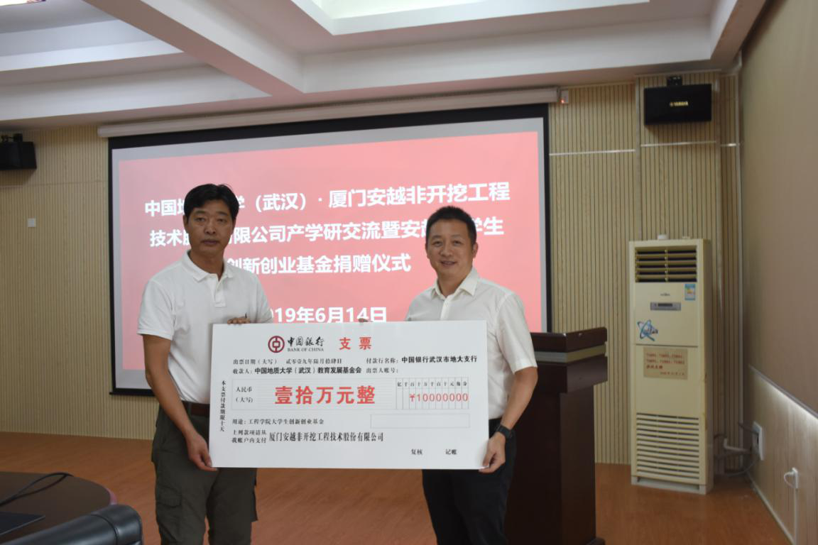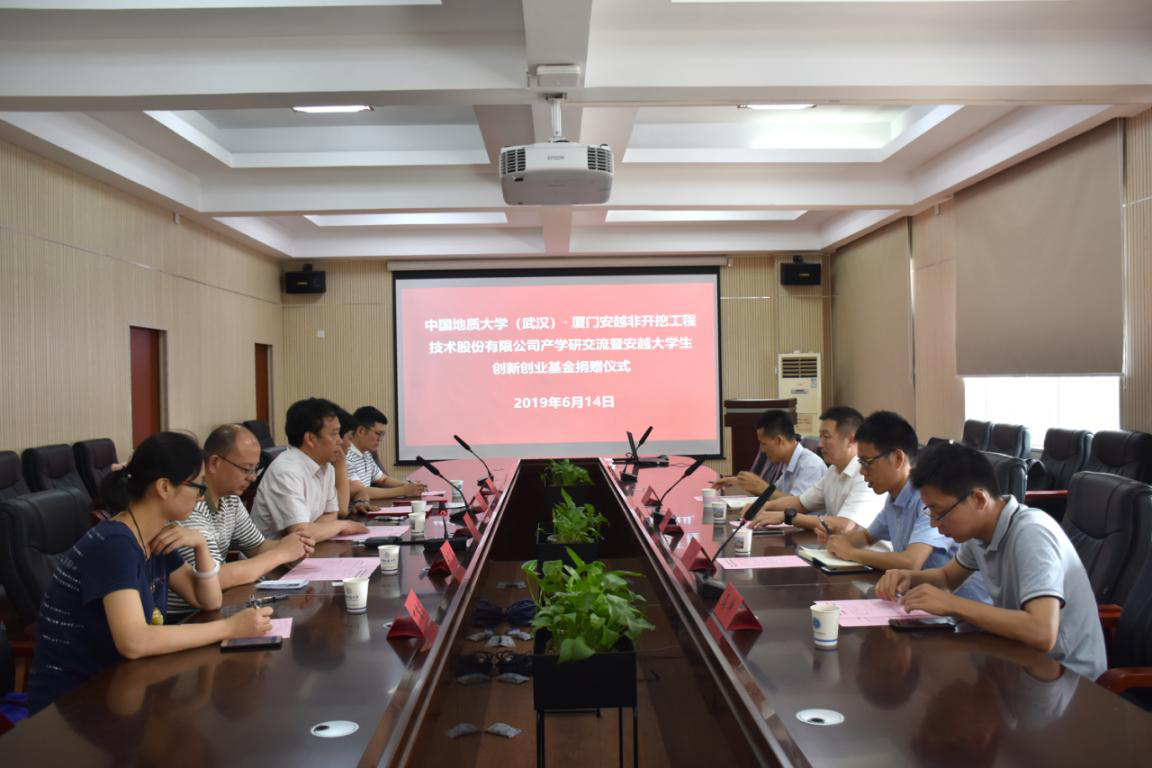 2019年6月14日上午,厦门安越非开挖技术股份有限公司来校作产学研交流,并捐赠10万设立安越大学生创新创业基金,捐赠仪式在315举行。厦门安越非开挖技术股份有限公司董事长廖宝勇一行、武汉中地大非开挖研究院有限公司总经理孔耀祖,校友工作与教育基金管理处副处长吕占峰、丁苗苗,mk网页版党委书记陈飞、党委副书记江广长、副教授曾聪参加会议。江广长主持会议。