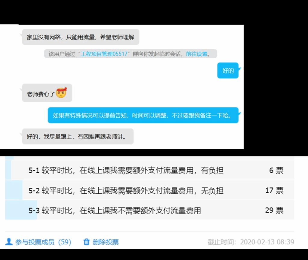 课程结束后,安全工程系教师合理布置作业,认真批阅,了解学生学习状态,并及时反馈课堂教学,对不遵守教学纪律学生进行批评教育。对家里没有宽带、手机信号不稳定等的学生,老师们特别关注,自掏腰包给6名困难学生每人补助50元上网费,减少学生负担;针对正在隔离中的学生,老师主动询问情况,为其解疑答惑,解决学习生活上的困难。