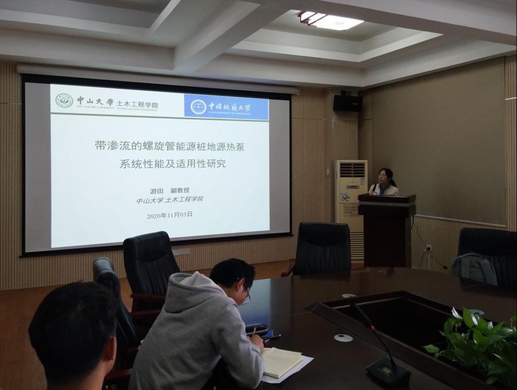 2020年11月3日下午,应mk网页版骆进副教授邀请,中山大学游田副教授作客工程文化论坛,在315会议室作了题为“带渗流的螺旋管能源桩地源热泵系统性能及其适用性研究”的学术报告。骆进副教授主持了此次论坛活动,学院50余名师生聆听了学术报告。