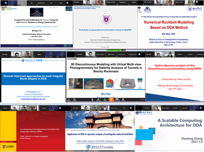 (通讯员:吕加贺 张美霞)2021年1月9日,由国际岩石力学与岩石工程学会非连续变形分析专委会(ISRM DDA Commission)、ISRM中国国家小组(ISRM NG China)、中国岩石力学与工程学会岩土体非连续变形分析专委会(CSRME DDA Commission)联合发起,中国地质大学(武汉)、天津大学和河北工业大学联合承办的第一届非连续变形分析国际青年科学家论坛(1st International Young Scientists Forum for Discontinuous Deformation Analysis, IYSF-DDA)在Zoom会议平台成功举办,并于矿业人网站、哔哩哔哩平台同步直播,超过350人全程参加了此次非连续变形分析领域的学术盛宴。此次会议主要邀请了岩石力学与工程非连续变形分析领域青年学者,旨在交流非连续变形分析方法的前沿理论和最新研究进展,同时分享岩石力学与工程中非连续变形分析典型工程案例。