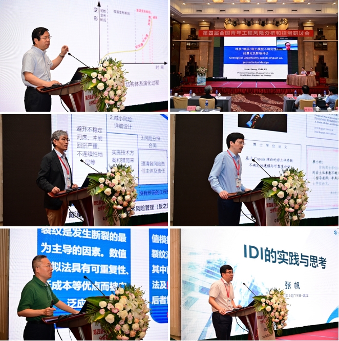 会议期间,各位专家学者以目前各自所属的专业方向及具体研究成果为主要内容,为线下线上参会人员作了精彩的学术报告。中国地质大学(武汉)唐辉明教授以《基于演化的滑坡防控理论与方法技术》为题作会议特邀报告,美国克莱姆森大学C. Hsein Juang教授在线上作《地质/地层/岩土模型不确定性的量化及影响评价》的特邀报告,同济大学黄宏伟教授以《工程风险管控存在的问题与适应性风险管理》为题作特邀报告,武汉大学李典庆教授以《Copula理论在岩土工程不确定性与可靠性分析中应用进展》为题作特邀报告,重庆大学周小平教授以《场富集有限元法及其应用》为题作特邀报告,中国大地保险张帆总经理应邀以《IDI的实践与思考》为题作特邀报告。