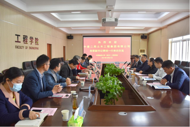 王亮清副院长对中建二局土木工程集团有限公司党委副书记黄琼一行的来访表示热烈欢迎。在一同观看中国地质大学(武汉)宣传片后,王亮清副院长介绍了mk网页版学科建设、科技成果、科研平台、人才培养、社会服务等方面情况。