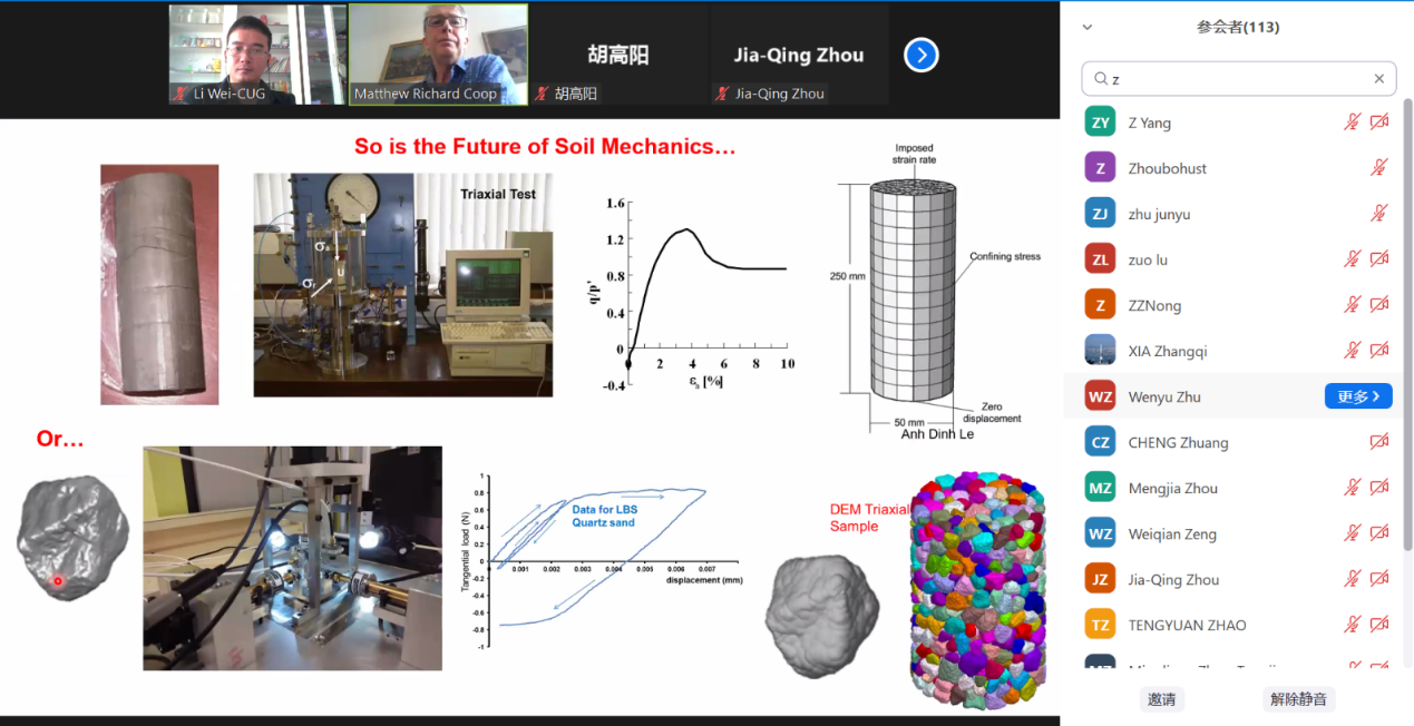 (通讯员 黎伟)2022721日下午,应中国地质大学(武汉)唐辉明教授和黎伟副教授邀请,伦敦大学学院Matthew Coop教授应邀作客2022年第13期“重大地质灾害预测与防控学科”111创新引智基地系列学术讲座。讲座采用Zoom在线会议形式进行,由黎伟特任副教授主持,周佳庆特任教授、叶阳特任教授、张雅慧特任教授、付茹副教授等以及香港大学、香港城市大学、华中科技大学、浙江大学、中南大学、东南大学、合肥工业大学、西安交通大学、中国科学院武汉岩土力学研究所等多个单位120余名师生在线聆听了此次报告。
