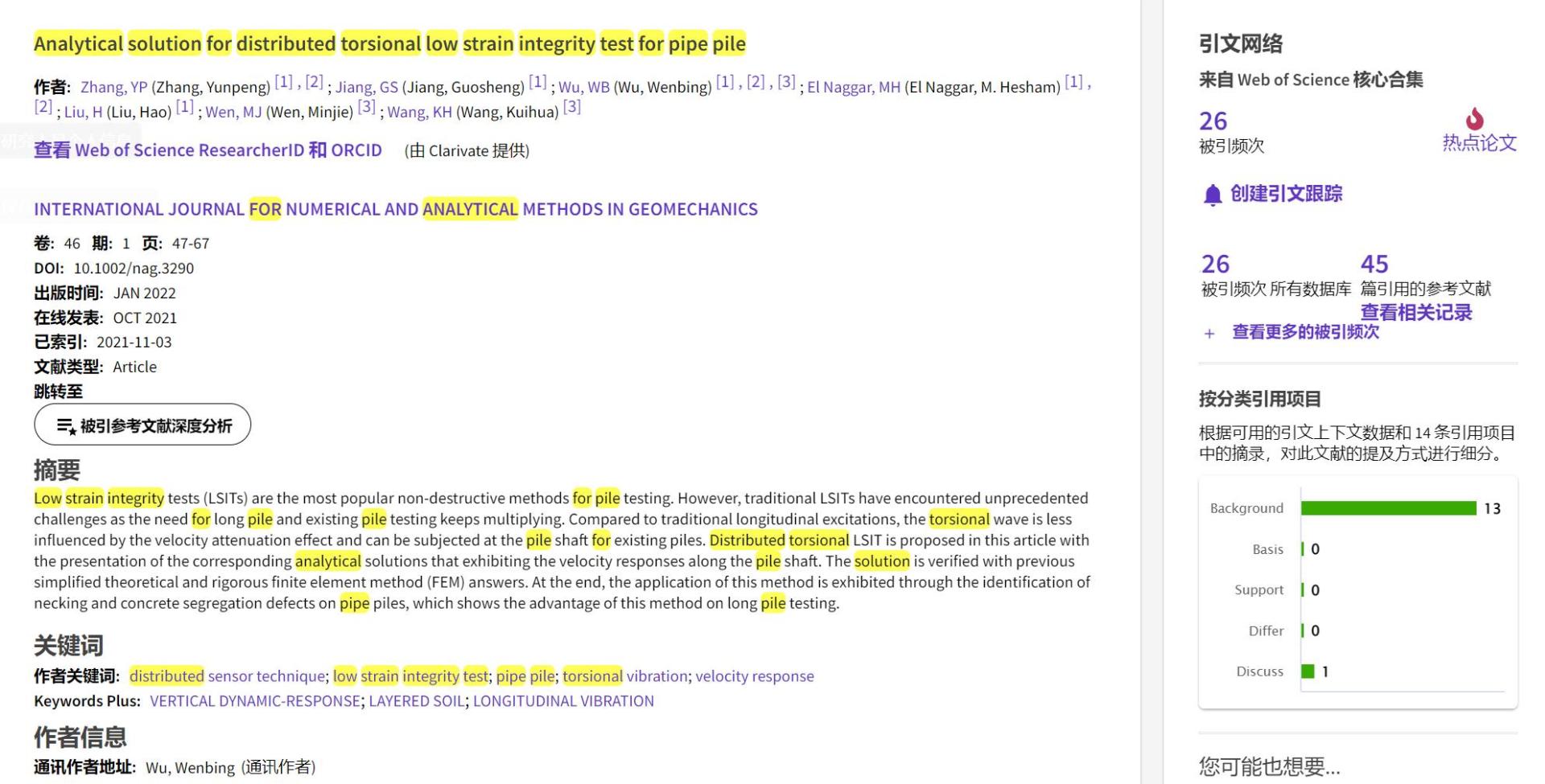 (通讯员 黄静)根据2022年9月基本科学指标数据库(Essential Science Indicators,简称ESI)最新数据显示,mk网页版勘察与基础工程系吴文兵教授团队于2021年在国际岩土工程数值计算权威期刊International Journal for Numerical and Analytical Methods in Geomechanics上发表的学术论文“Analytical solution for distributed torsional low strain integrity test for pipe pile”入选ESI热点论文(Hot Paper)。该论文第一作者为2020级博士研究生张云鹏,通讯作者为吴文兵教授,中国地质大学(武汉)mk网页版为第一署名单位。