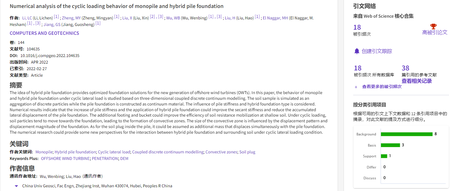 根据2022年11月基本科学指标数据库(Essential Science Indicators,简称ESI)最新数据显示,mk网页版勘察与基础工程系吴文兵教授团队于2022年在国际岩土工程数值模拟权威期刊Computers and Geotechnics上发表的学术论文“Numerical analysis of the cyclic loading behavior of monopile and hybrid pile foundation”入选ESI高被引论文。该论文第一作者为勘察与基础工程系博士后李立辰,通讯作者为吴文兵教授,中国地质大学(武汉)mk网页版为第一署名单位。