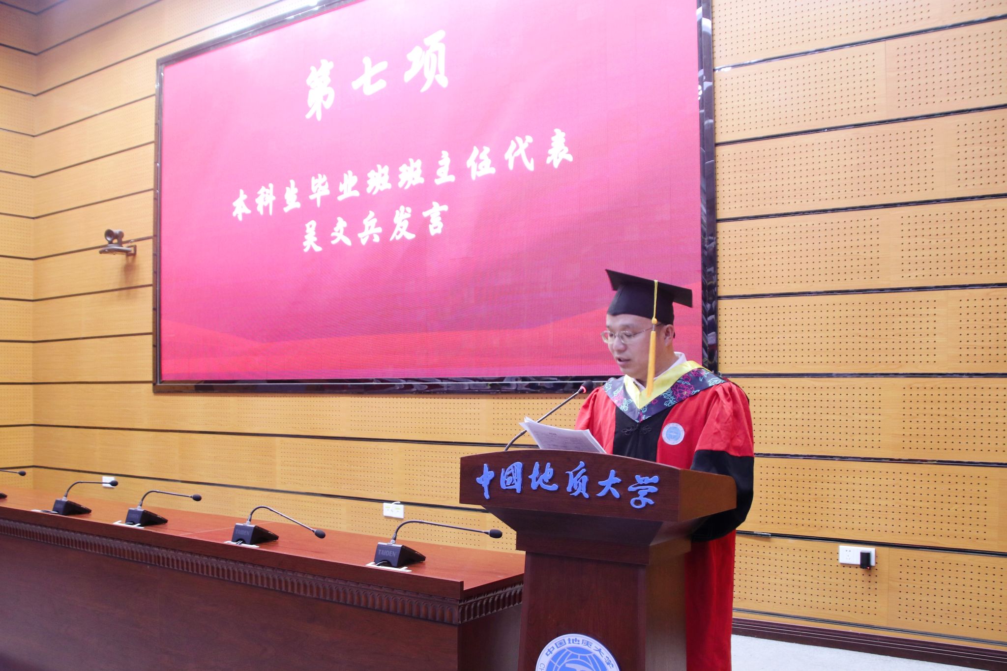 本科生毕业班班主任代表吴文兵发言。他回顾了学院的光荣历史和工程人求真务实、开拓创新的精神底色,鼓励毕业生们继承学院优良传统,以科学态度解决复杂工程难题,用实际行动践行扎根基层、服务国家的使命,勇立科技浪潮之首,以严谨治学和开拓创新精神引领变革。