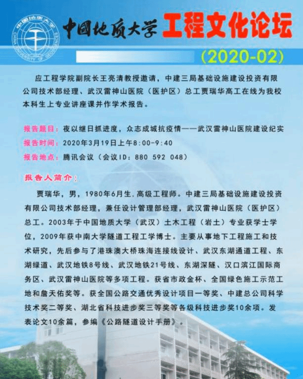 除了云课堂正常授课之外,为了拓宽同学们的视野,增加他们的学习和热情,我系老师还多次组织了校外著名专家学者的讲座授课。3月份,应mk网页版副院长王亮清教授邀请,中建三局基础设施建设投资有限公司技术部经理、武汉雷神山医院(医护区)总工贾瑞华高工,在线为我校本科生上专业讲座课并作学术报告。正是有了老师和学生们的共同努力,我系这一学期“停课不停学”的所有课程都达到了圆满的效果。