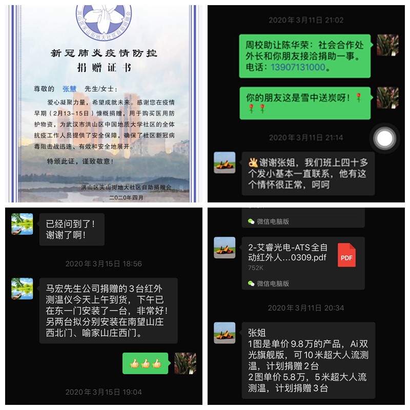 实验中心张慧同志是我校喻家山庄业主委员会主任。疫情爆发后,她迅速联系业委会委员,配合居委会发布通告,及时了解学校及小区居民的发病人员情况。在物业管理人员缺乏,小区消杀物资有限的情况下,组织成立业主自救小组,将业主中的医务人员充实到组织中来。借助学校物业管理的能力对小区的公共区域进行大规模的消杀.多方联系团购渠道,为小区居民提供了便利。进一步完善各楼栋单元的QQ群,摸清现在居住在小区的住户名单及家居人口数。在缺乏防护物质的前提下,不等不靠,组织业主捐款购买护防装备提供给医护人员,保卫人员,社区工作人员,物业管理人员及小区志愿服务人员。在张慧同志的带领和组织下,广大业主积极响应,共筹得善款十七万余元。同时,张慧同志联系到烟台睿创维纳技术股份有限公司的朋友,给我校捐赠了三台ITS智能红外体温检测设备,分别投入到学校东一门、南望山庄西北门和喻家山庄西门使用,大大提高了体温的检测效率和准确性。